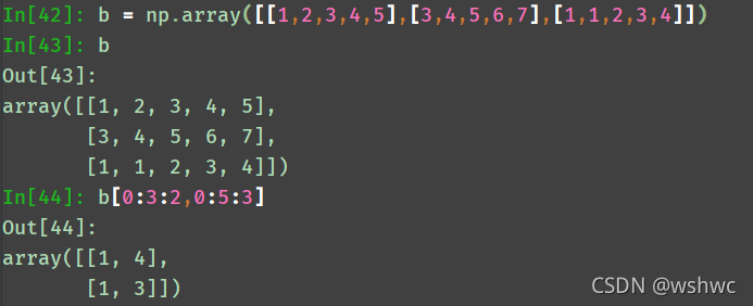 (2) 抽取的列为0:5:3,即[0,5)列中每3列取一列,则取出来是第0列和第3列。