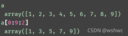 解释:a[0:9:2]表示向量中第[0~9)位置处的数据按照每2个取一个的规则取出。由于0~9是前闭后开区间,所以等价于抽取第0,2,4,6,8个位置的数据