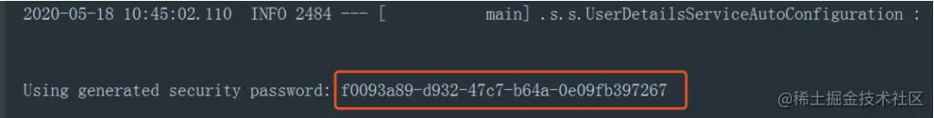 这个配置开启了一个表单认证,所有服务的访问都必须先过这个认证,默认的用户名为user,密码由Sping Security自动生成,回到IDE的控制台,可以找到密码信息: