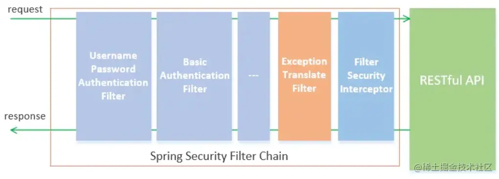 在过滤器链的末尾是一个名为FilterSecurityInterceptor的拦截器,用于判断当前请求身份认证是否成功,是否有相应的权限,当身份认证失败或者权限不足的时候便会抛出相应的异常。ExceptionTranslateFilter捕获并处理,所以我们在ExceptionTranslateFilter过滤器用于处理了FilterSecurityInterceptor抛出的异常并进行处理,比如需要身份认证时将请求重定向到相应的认证页面,当认证失败或者权限不足时返回相应的提示信息。