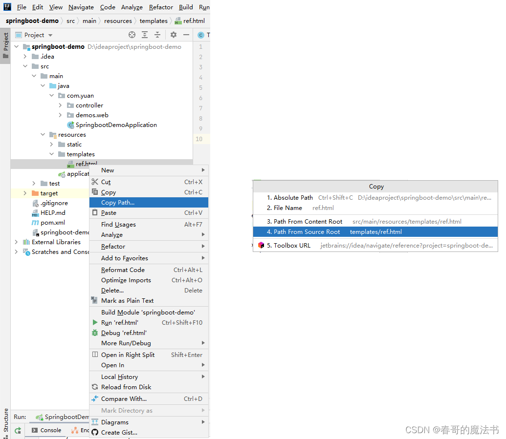 String 返回类型对应的返回值 就是 转页路径, 本例中应该是 templates > ref.html