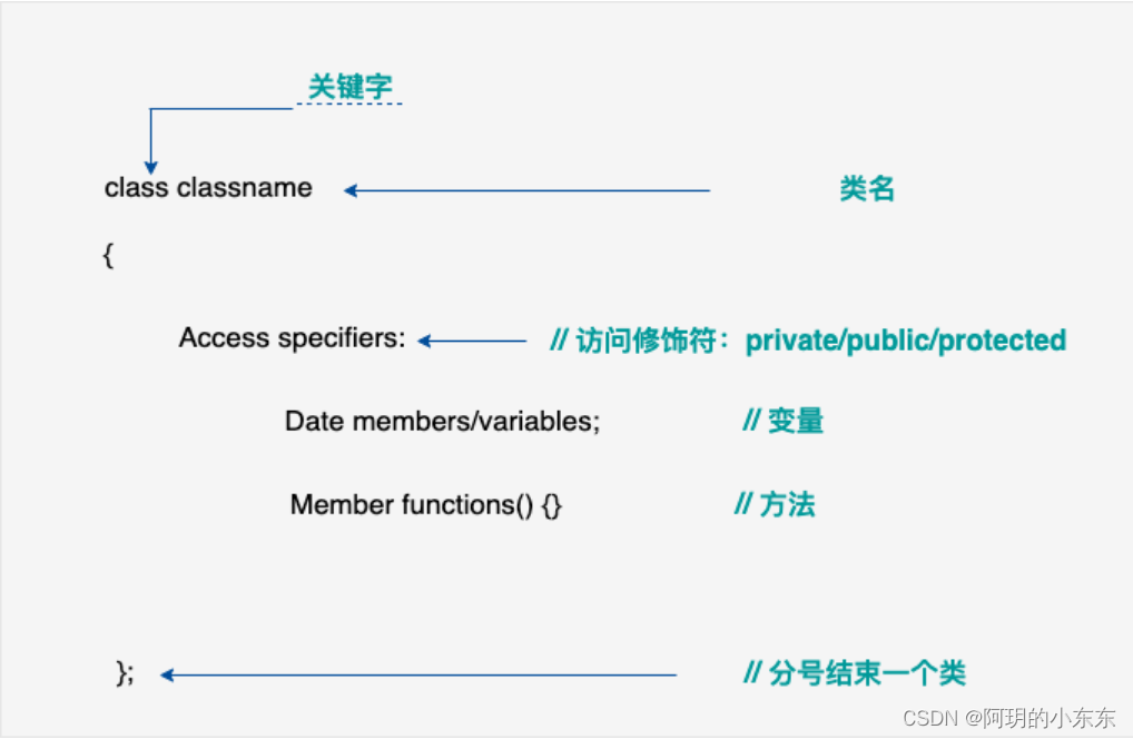 定义一个类需要使用关键字 class,然后指定类的名称,并类的主体是包含在一对花括号中,主体包含类的成员变量和成员函数。
