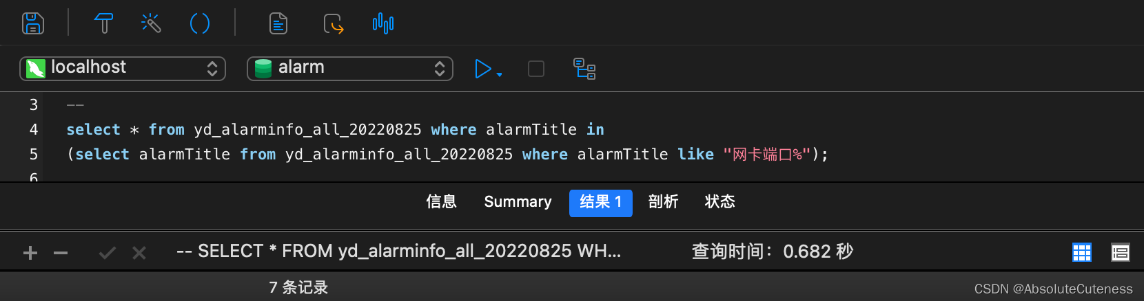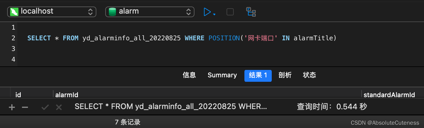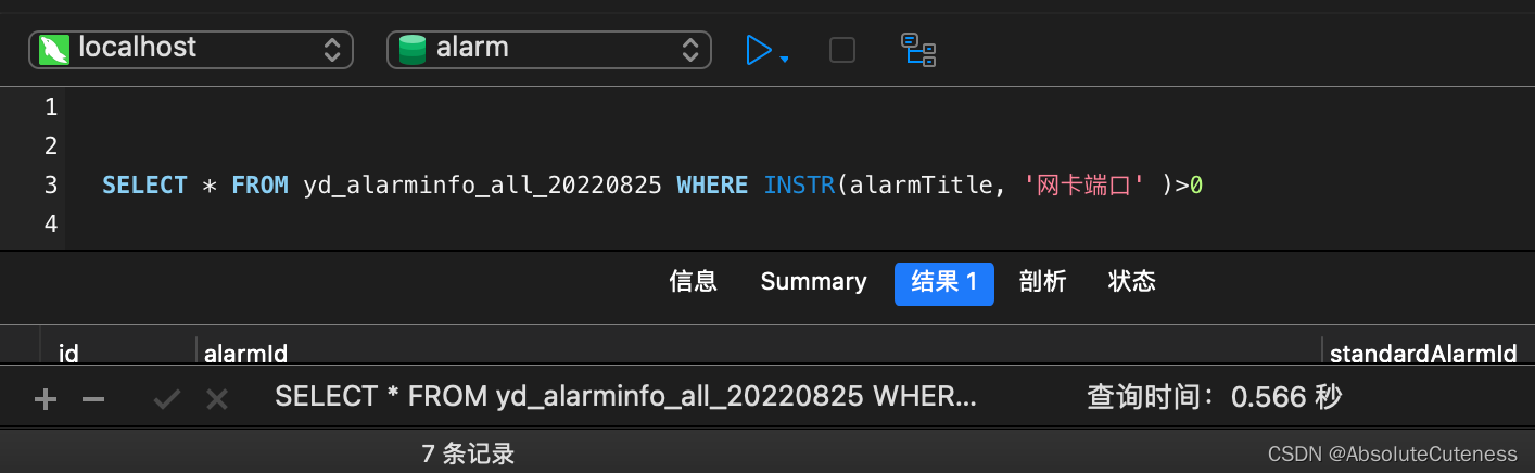 SELECT * FROM yd_alarminfo_all_20220825 WHERE INSTR(alarmTitle, '网卡端口' )>0 --查询耗时:0.566