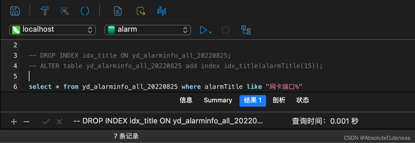 # 删除旧索引 DROP INDEX idx_title ON yd_alarminfo_all_20220825; # 创建左前缀索引(索引创建语句只比普通索引多了‘(15)') ALTER table yd_alarminfo_all_20220825 add index idx_title(alarmTitle(15)); -- 查询耗时:0.01