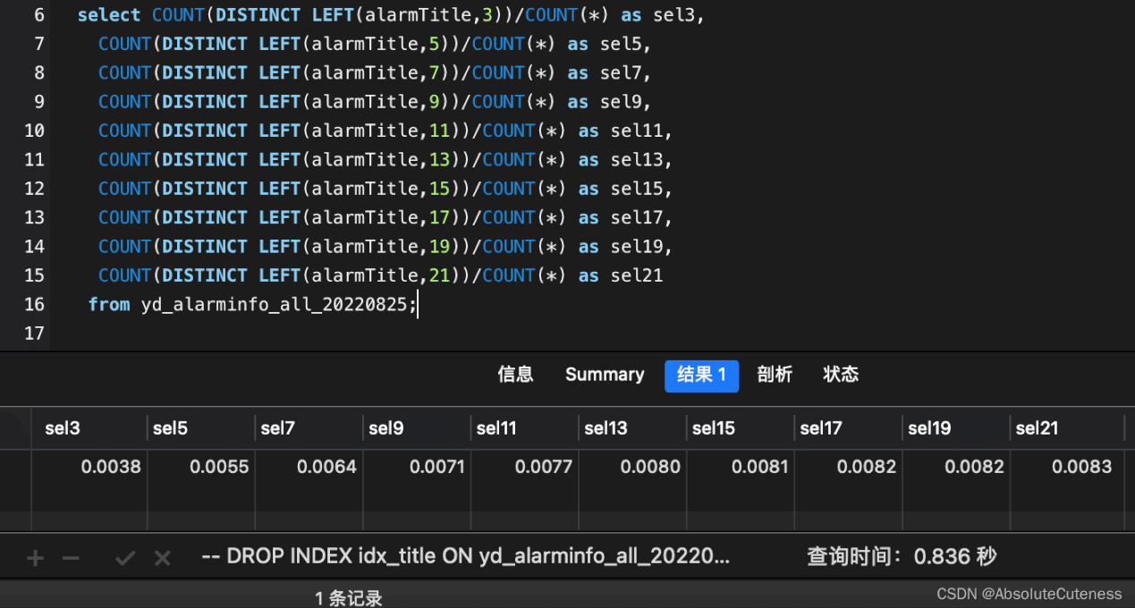 select COUNT(DISTINCT LEFT(alarmTitle,3))/COUNT(*) as sel3, COUNT(DISTINCT LEFT(alarmTitle,5))/COUNT(*) as sel5, COUNT(DISTINCT LEFT(alarmTitle,7))/COUNT(*) as sel7, COUNT(DISTINCT LEFT(alarmTitle,9))/COUNT(*) as sel9, COUNT(DISTINCT LEFT(alarmTitle,11))/COUNT(*) as sel11, COUNT(DISTINCT LEFT(alarmTitle,13))/COUNT(*) as sel13, COUNT(DISTINCT LEFT(alarmTitle,15))/COUNT(*) as sel15, COUNT(DISTINCT LEFT(alarmTitle,17))/COUNT(*) as sel17, COUNT(DISTINCT LEFT(alarmTitle,19))/COUNT(*) as sel19, COUNT(DISTINCT LEFT(alarmTitle,21))/COUNT(*) as sel21 from yd_alarminfo_all_20220825;