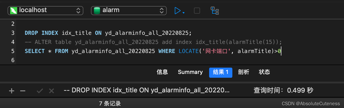 -- 删除旧索引 DROP INDEX idx_title ON yd_alarminfo_all_20220825; -- LOCATE SELECT * FROM yd_alarminfo_all_20220825 WHERE LOCATE('网卡端口', alarmTitle)>0 -- 查询耗时:0.499