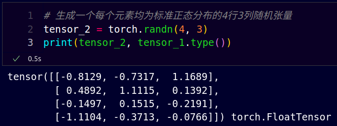 import torch # 生成一个每个元素均为标准正态分布的4行3列随机张量 tensor_2 = torch.randn(4, 3) print(tensor_2, tensor_1.type())