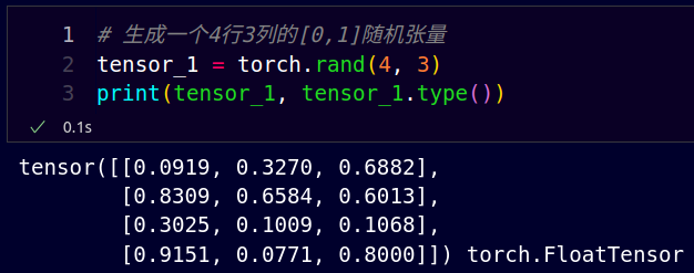 import torch # 生成一个每个元素服从0-1均匀分布的4行3列随机张量 tensor_1 = torch.rand(4, 3) print(tensor_1, tensor_1.type())