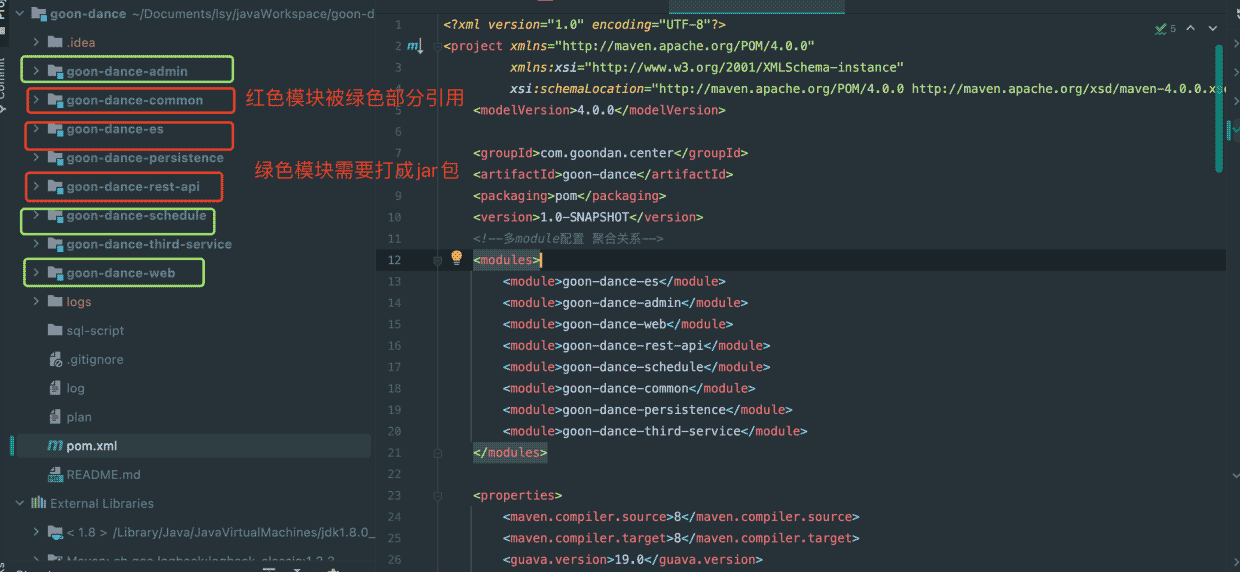 项目开发过程中,我们会构建多模块maven工程。例如结构如下springboot工程。其中,绿色模块需要构建成可执行.jar包文件,红色模块是底层抽象模块被绿色模块引用。