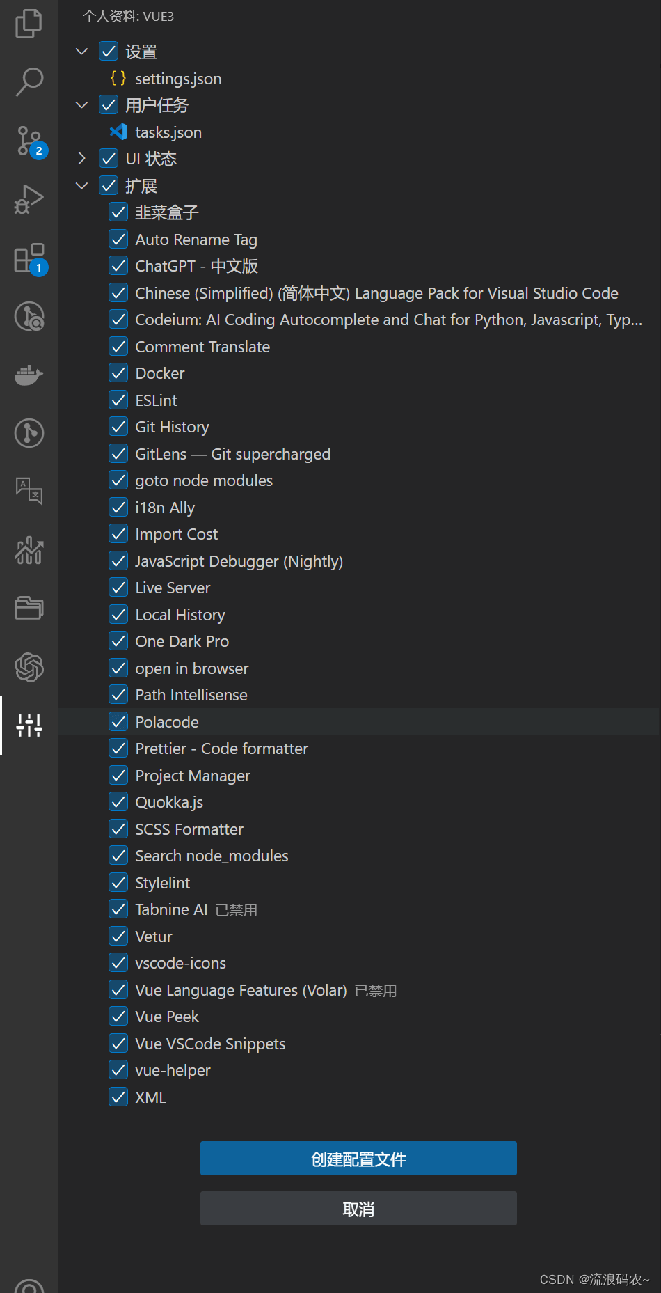 输入名称后,会在左边看到一个弹出层。根据需要进行勾选不同的扩展,我这里是创建vue3的配置,所以就需要把vetur去掉,volar勾上。