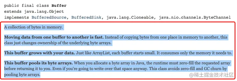 Buffer 是一个大小可变的字节缓冲区,在Okio中Buffer是BufferedSource和BufferedSink的接口实现类,用户实现字节数据的缓冲与读写。