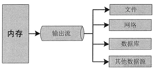 输出流:内存——>外设与输入流相反,是将内存数据写入到各种外设(如文件、网络、数据库、显示器等);