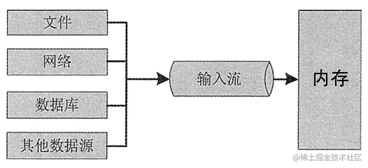 输入流:外设——>内存将数据从各种外设(如键盘、文件、网络、数据库等)读取到内存中;