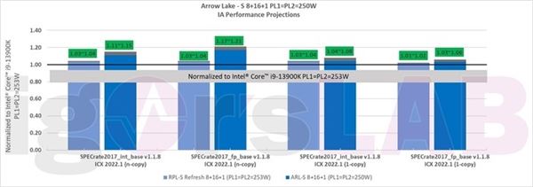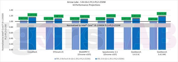 另一家外媒Igor’sLAB则爆料了一张图标,以当前的酷睿i9-13900K为基准线,标明了Raptor Lake-S Refresh与Arrow Lake-S的相对性能。