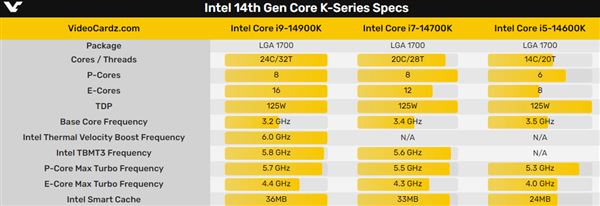 这次发布的只有六款型号,分别是8+16 24核心的i9-14900K/KF、8+12 20核心的i7-14700K/KF、6+8 14核心的i5-14600K/F,都是基准功耗125W,继续兼容LGA1700接口的600/700系列主板。其中,i9-14900K/KF的最高加速频率为6GHz,比现在的i9-13900K/KF提升200MHz,这也是i9-13900KS限量版之外第一款达到6GHz频率的常规产品。