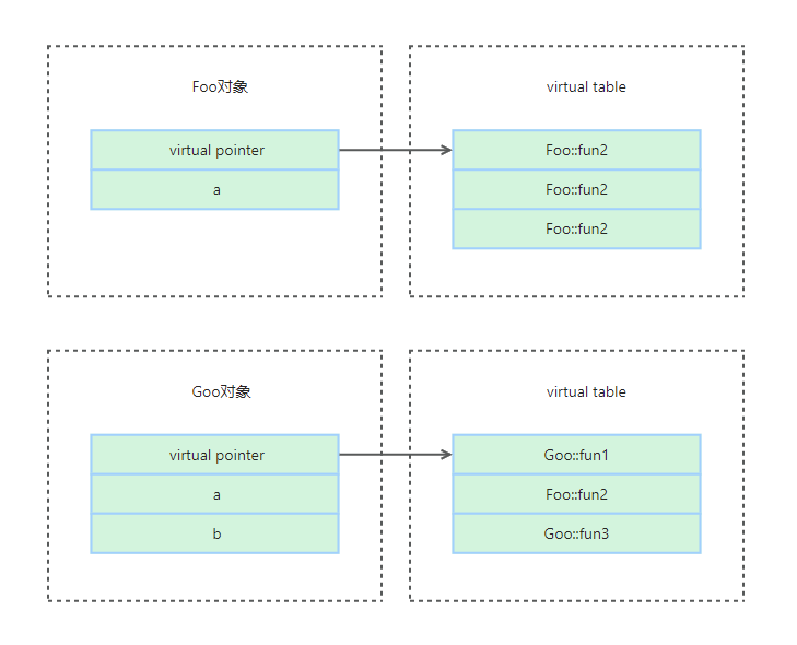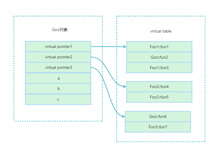 Goo::fun1、Goo::fun3),对于基类中的虚函数但是派生类中没有override,则会把基类的函数地址写到虚表中(Foo::fun2),在调用函数的时候,会通过虚指针转到虚表,并根据虚函数的偏移得到真实函数地址,从而实现多态。面试官:不错。上图你画出了单一继承的内存布局,那多继承呢?