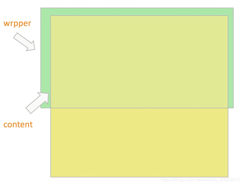 绿色部分为 wrapper,也就是父容器,它会有固定的高度。黄色部分为 content,它是父容器的第一个子元素,它的高度会随着内容的大小而撑高。那么,当 content 的高度不超过父容器的高度,是不能滚动的,而它一旦超过了父容器的高度,我们就可以滚动内容区了,这就是 better-scroll 的滚动原理。