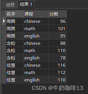 SELECT 名字,course 课程,score 分数 from ( SELECT "name" 名字,"chinese" 语文,"math" 数学,"english" 英语 from "grade2") unpivot (score for course in(语文,数学,英语))