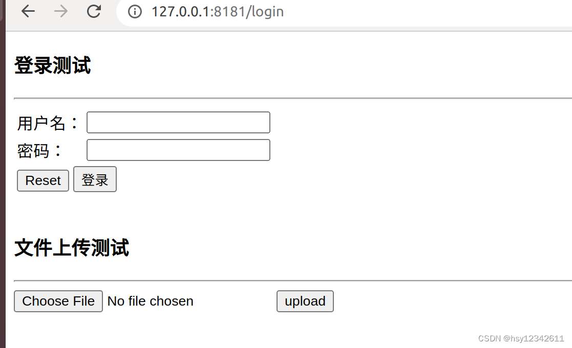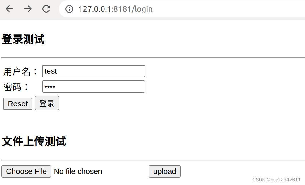 <!DOCTYPE html> <html lang="en"> <head> <meta charset="UTF-8"/> <title>欢迎进入首页</title> </head> <body> <h3>登录测试</h3> <hr/> <form action="http://localhost:8181/login" method="post"> <table border=0 title="测试"> <tr> <td>用户名:</td> <td><input type="text" name="username"></td> </tr> <tr> <td>密码:</td> <td><input type="password" name="password"></td> </tr> <tr> <td colspan=2> <input type="reset" /> <input type="submit" value="登录" /> </td> </tr> </table> </form> <br> <h3>文件上传测试</h3> <hr/> <form action="http://localhost:8181/upload" method="post" enctype="multipart/form-data"> <input type="file" name="uploadfile"/> <input type="submit" value="upload"> </form> </body> </html>