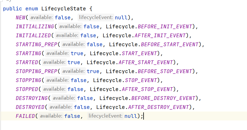 public static final String BEFORE_START_EVENT = "before_start"; public static final String AFTER_START_EVENT = "after_start"; public static final String STOP_EVENT = "stop"; public static final String BEFORE_STOP_EVENT = "before_stop"; public static final String AFTER_STOP_EVENT = "after_stop"; public static final String AFTER_DESTROY_EVENT = "after_destroy"; public static final String BEFORE_DESTROY_EVENT = "before_destroy"; /** * The LifecycleEvent type for the "periodic" event. * 周期性事件(后台线程定时执行一些事情,比如:热部署、热替换) */ public static final String PERIODIC_EVENT = "periodic"; public static final String CONFIGURE_START_EVENT = "configure_start"; public static final String CONFIGURE_STOP_EVENT = "configure_stop";