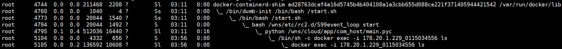 root 27678 0.3 0.4 512172 16500 Sl python /wns/cloud/app/com_host/main.pyc root 25011 0.0 0.0 4332 652 S \_ /bin/sh -c docker exec -i mongo_docker_master ls root 25014 0.0 0.2 136592 10600 Sl \_ docker exec -i mongo_docker_master ls