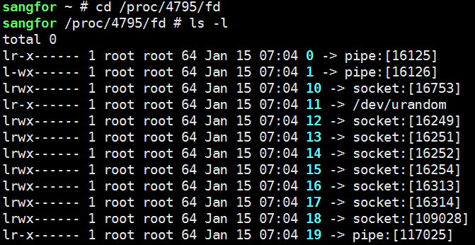 root@localhost:/proc/27678# ls -l ./fd total 0 lr-x------ 1 root root 64 Mar 26 17:19 0 -> pipe:[30690124] l-wx------ 1 root root 64 Mar 26 17:19 1 -> pipe:[30690125] lrwx------ 1 root root 64 Mar 26 17:19 10 -> socket:[30691732] lr-x------ 1 root root 64 Mar 26 17:19 11 -> /dev/urandom lrwx------ 1 root root 64 Mar 26 17:19 12 -> socket:[30719611] lrwx------ 1 root root 64 Mar 26 17:19 13 -> socket:[30719610] lr-x------ 1 root root 64 Mar 26 17:19 14 -> pipe:[38483750]