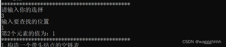 int GetElem_L(LinkList L, int i, int& data) { int j = 1; Lnode* p; p = L->next; while (p && j < i) { p = p->next; j++; } if (!p || j > i) return 0; data = p->data; return 1; }