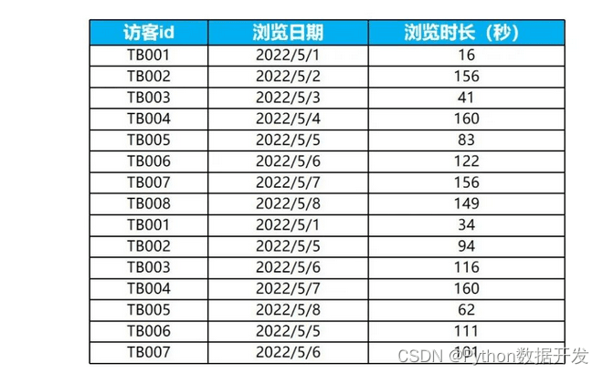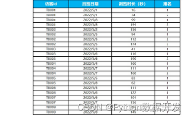 order by <用于排序的列名>)根据题目要求得出每个访客和对应的浏览日期,我们对访客id ,浏览时间进行分组,对浏览时长(秒)进行排序。