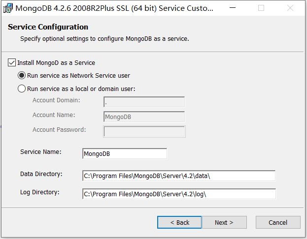C:\Program Files\MongoDB\Server\4.2\bin\mongod.exe --config "C:\Program Files\MongoDB\Server\4.2\bin\mongod.cfg" --install --serviceName "MongoDB"