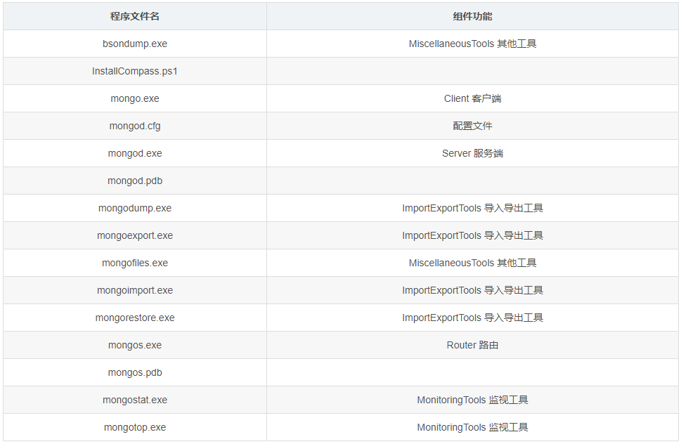 mongo.exe为客户端程序;mongod.exe为服务端程序;其他程序及文件功能如下列表