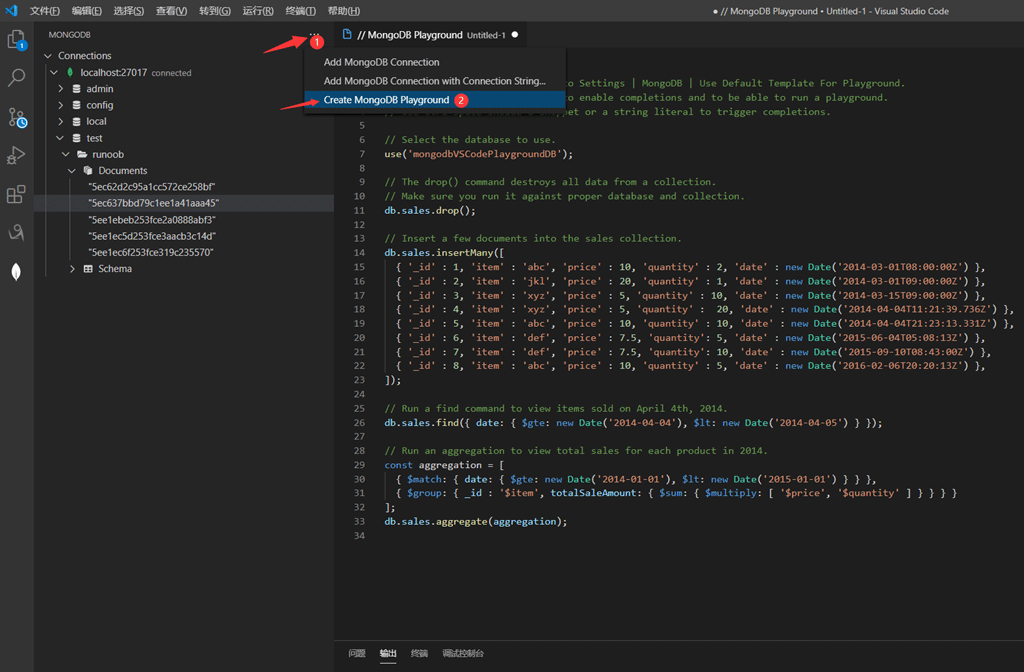MongoDB 操练场是直接在VS Code内部对CRUD操作和其他MongoDB命令进行原型设计和执行的最便捷方法。