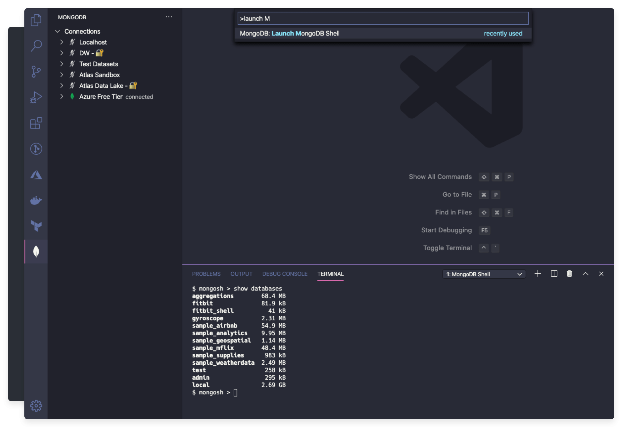 从命令面板启动MongoDB Shell,以快速连接到VS Code中处于活动状态的同一集群。