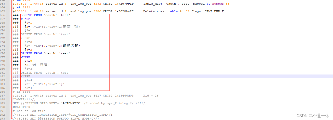 mysqlbinlog --no-defaults --base64-output=decode-rows -v --database=oauth --start-datetime="2023-06-01 01:44:00" --stop-datetime="2023-06-01 01:48:00" F:\mysql-8.0.29-winx64\data\binlog.000058 > E:\test\result\db.sql