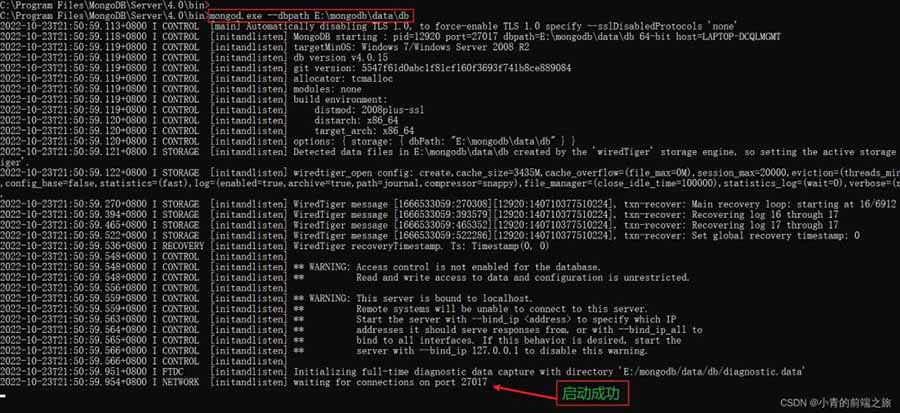 在启动MongoDB的同时,创建数据库文件夹,我当前存储到E盘mongodb\data\db文件夹名称必须符合规范,不能有中文、空格和特殊符号,只能使用英文、数字和下划线在设定的文件夹中,存储MongoDB相关的数据库文件启动命令:mongod.exe --dbpath E:\mongodb\data\db