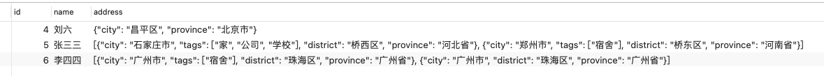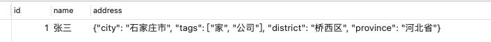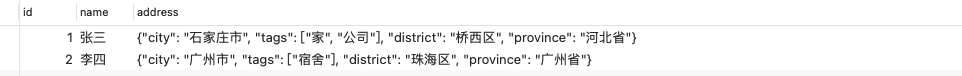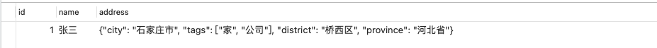 INSERT INTO `users` VALUES (1, '张三', '{\"city\": \"石家庄市\", \"tags\": [\"家\", \"公司\"], \"district\": \"桥西区\", \"province\": \"河北省\"}');