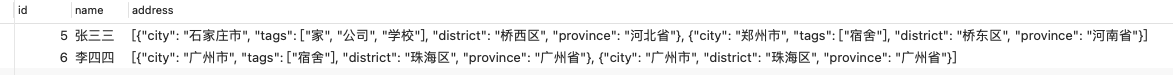 INSERT INTO `users` VALUES (5, '张三三', '[{\"city\": \"石家庄市\", \"tags\": [\"家\", \"公司\", \"学校\"], \"district\": \"桥西区\", \"province\": \"河北省\"}, {\"city\": \"郑州市\", \"tags\": [\"宿舍\"], \"district\": \"桥东区\", \"province\": \"河南省\"}]');