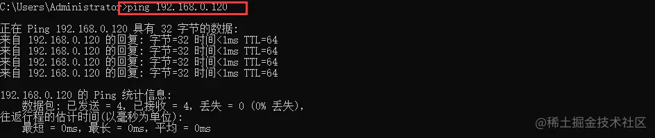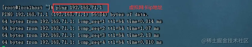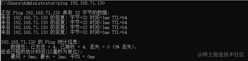 以上未出现丢包信息,说明linux系统也能ping通主机。因此两者已经互通。