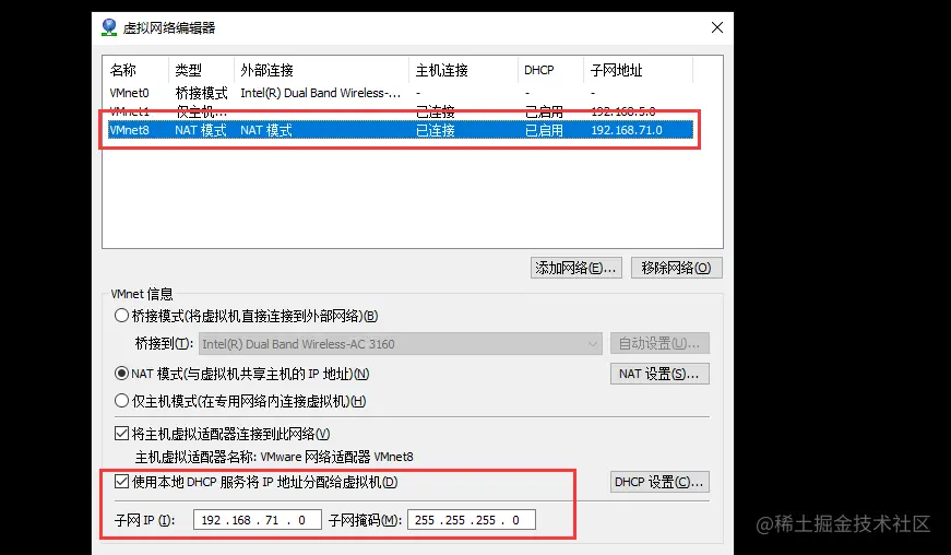 NAT模式是在主机上虚拟了一个网卡,因此配置的ip、子网掩码等都需要跟其保持一致。