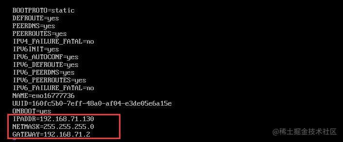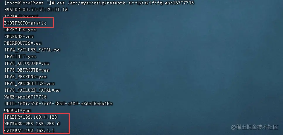 BOOTPROTO="static"#IP 的配置方法[ none | static | bootp | dhcp ](引导时不使用协议|静态分配 IP|BOOTP 协议|DHCP 协议)
