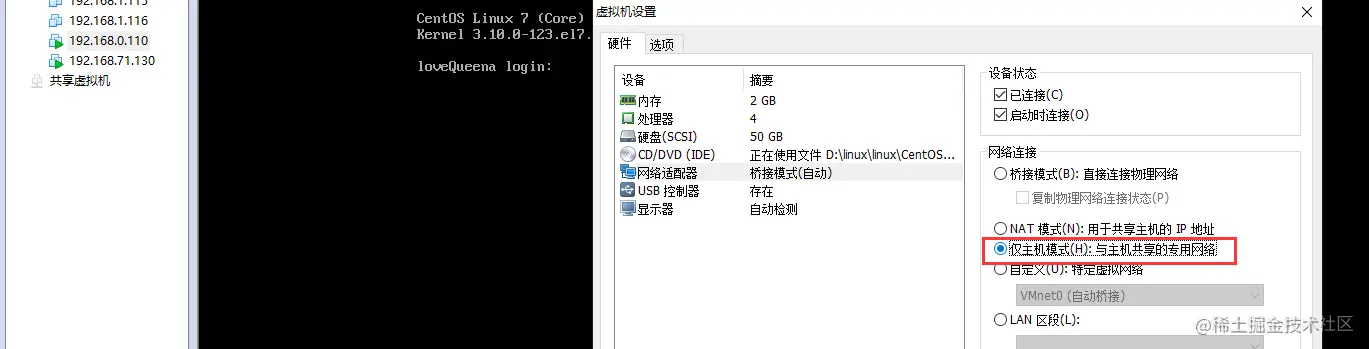 2、虚拟机安装的系统网络适配器设置为仅主机模式