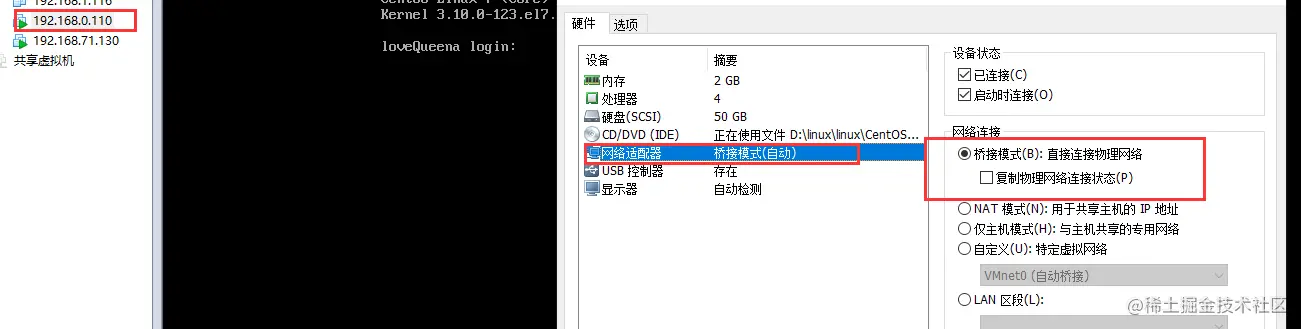 2、虚拟机安装的系统网络适配器设置为桥接模式
