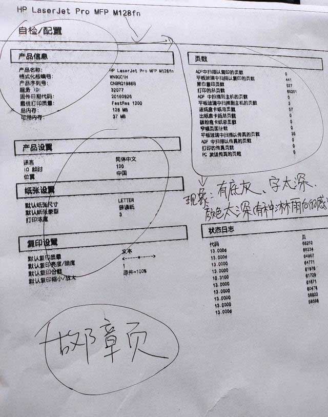 惠普HPm128nf打印内容颜色很重、有底灰、内容像是被水淋过,如下图所示: