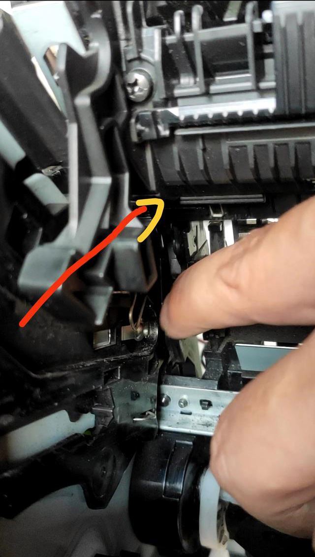 导致故障现象的出现原因是定影加热组件上门一个小盖板没有安装好,hpm128nf的定影加热组件和hpm1136、hpm126a的基本是一样的,但是就多了一个小盖板,定影加热组件拆掉后再安装时,一定把硒鼓取出来,这个小盖板和硒鼓传感器杆子之间还有另一个导杆,定影加热组件正确安装后,再安装硒鼓,硒鼓的传感器杆会通过另一个导杆把定影加热组件上的小盖板打开。