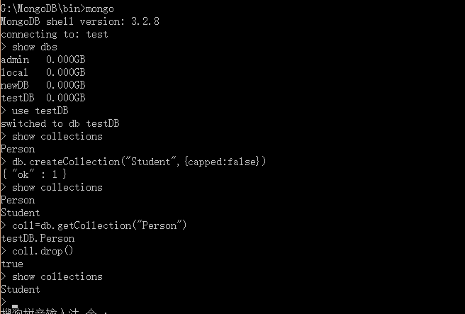 在上面的截图中可以看到,我先列出数据库列表,然后转到testDB数据库,显示该数据库下的集合列表只有一个Person,然后使用CreateCollection创建一个集合Student,此时集合列表显示出两个。然后呢,获得集合Person对象coll,使用drop删除几个,此时集合列表剩下一个。