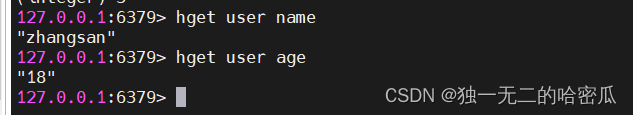 | HGET [key] [field] | 获取一个hash类型key的field的值 |