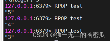 | RPOP [key] | 移除并返回列表右侧第一个元素, 没有返回nil |