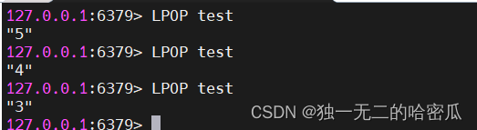 | LPOP [key] | 移除并返回列表左侧的第一个元素, 没有返回nil |