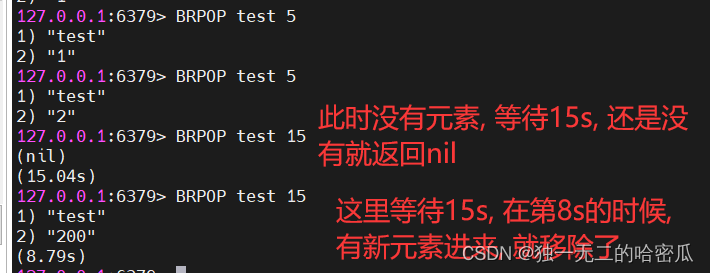 | BRPOP [key] ([key]…) [timeout] | 在没有元素的时候等待指定时间, 而不是返回nil |