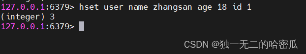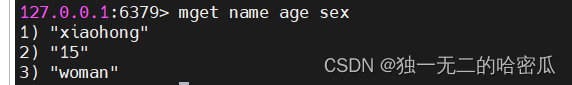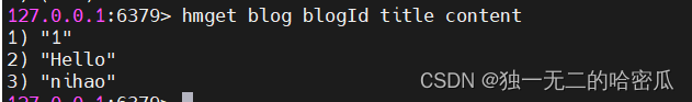| HMGET [key] [field] ( [field] …) | 批量获取多个hash类型key的field的值 |