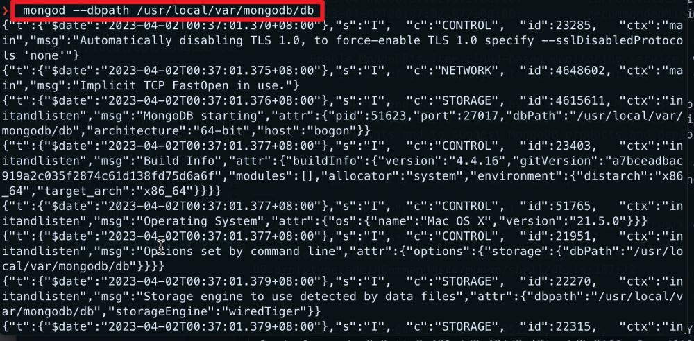 执行命令:mongod --dbpath /usr/local/var/mongodb/db ,启动OK。